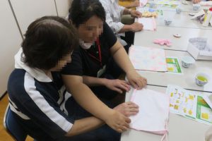 タオルハンカチはきれいに丸めるのがなかなか大変です。さっそく真剣な表情で作業に入られる皆さん。